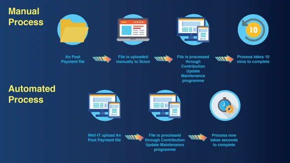 We would not be able to process this volume of payments without automation. Core had always processed these payments through a payroll deduction format. We would receive a payment file from An Post and upload the file into Scion and process them through Contribution Update Maintenance.