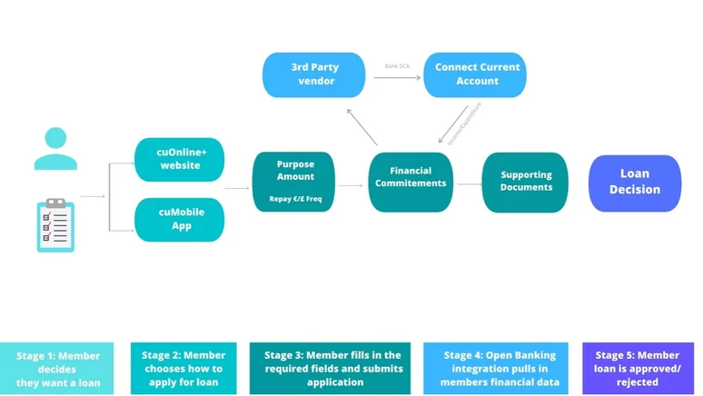 We’ve integrated the process of connecting your current account to the online loan application form to enable the Credit Union to analyse your members’ income and expenditure. This will be available in summer 2021. Below is a flow chart showing how applying for a loan will work once integrated with Open Banking.